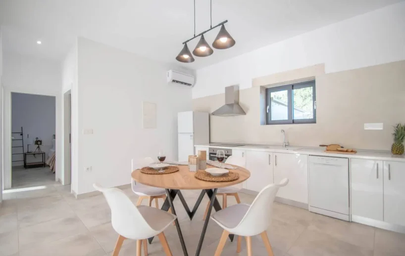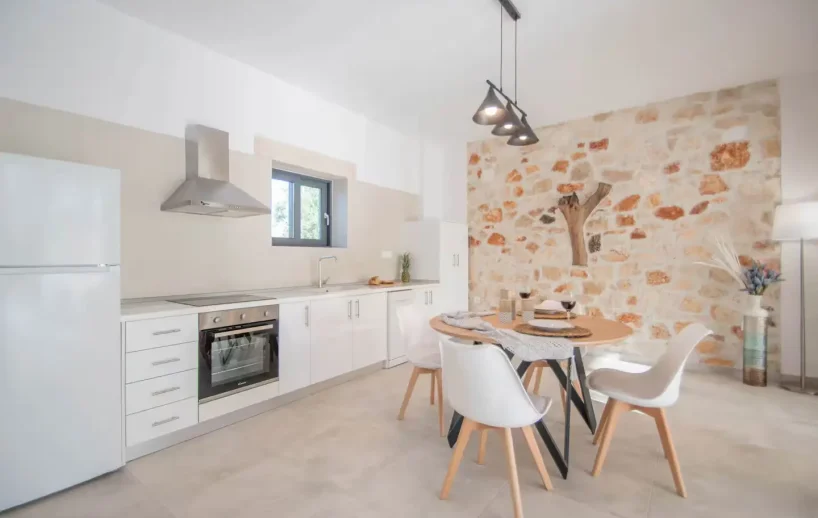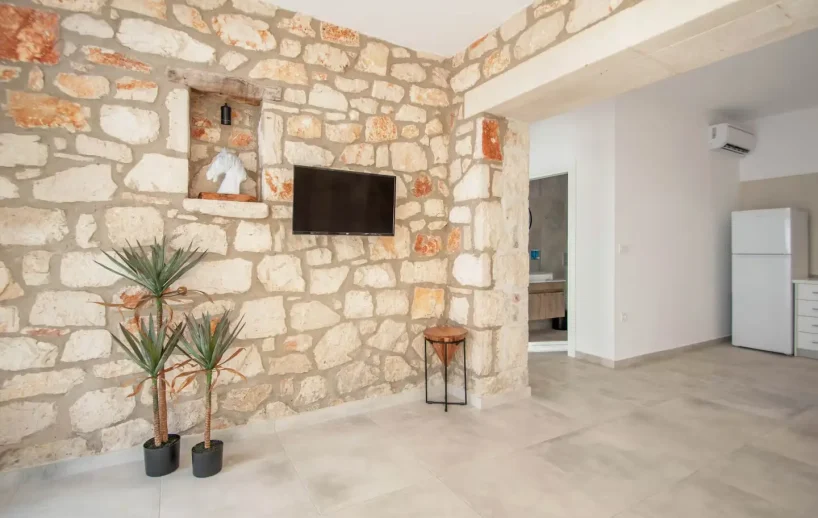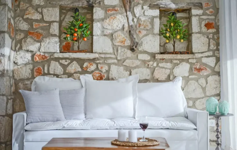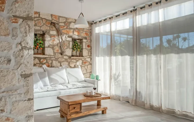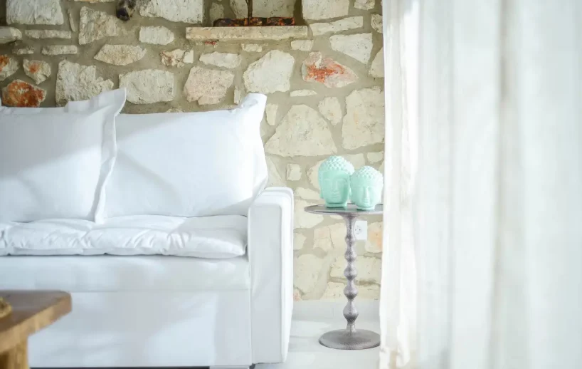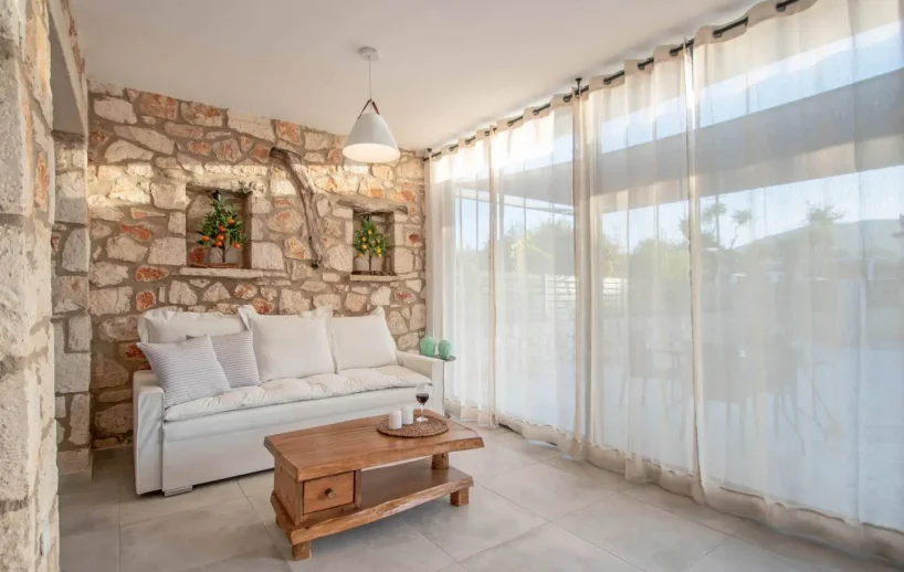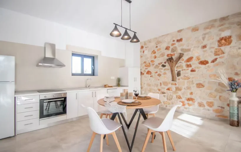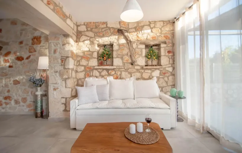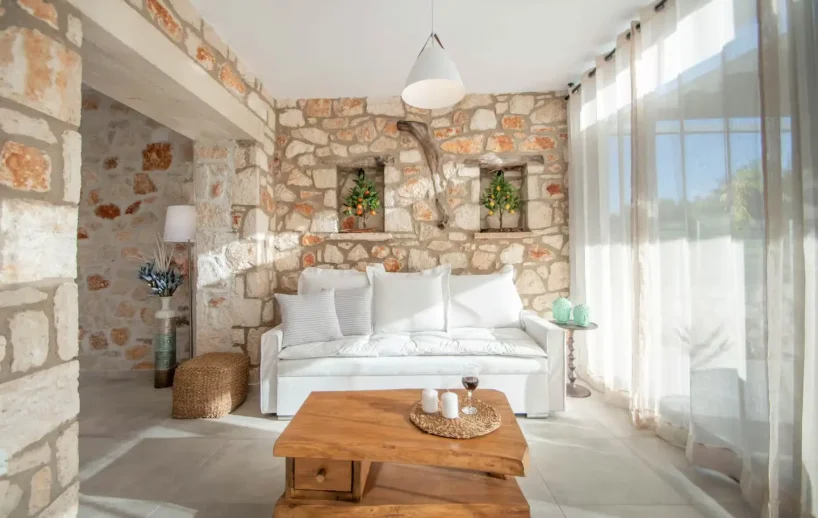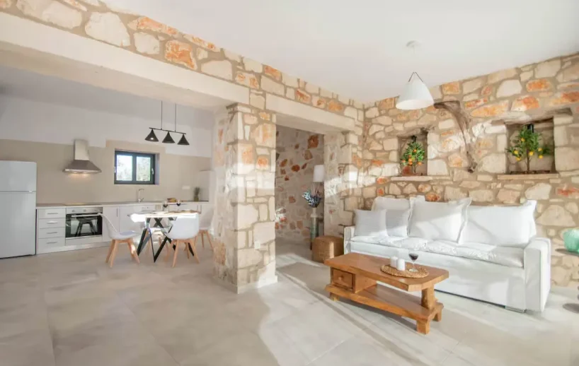 Στο εσωτερικό, η Villa Dionisis γοητεύει με τον συνδυασμό παραδοσιακής πέτρινης αρχιτεκτονικής και μοντέρνου σχεδιασμού. Ο φωτεινός χώρος καθιστικού, πλαισιωμένος από μεγάλες γυάλινες πόρτες, πλημμυρίζει με φυσικό φως, ενώ οι πέτρινοι τοίχοι χαρίζουν ζεστασιά και χαρακτήρα. Η πλήρως εξοπλισμένη κουζίνα με σύγχρονες συσκευές και η κομψή τραπεζαρία καθιστούν την προετοιμασία και το μοίρασμα γευμάτων μια πραγματικά ευχάριστη εμπειρία.