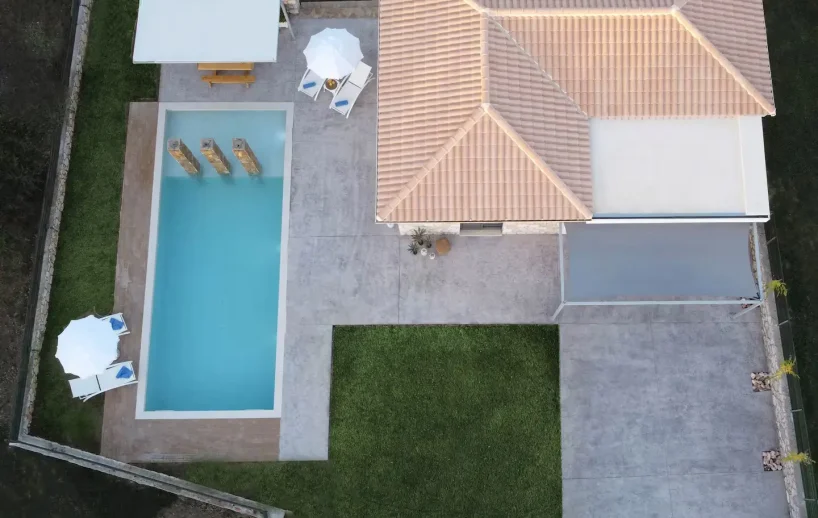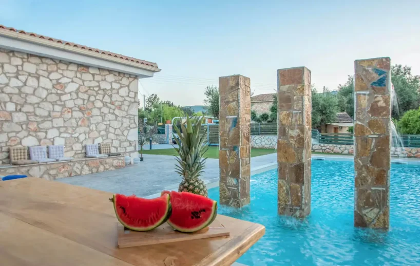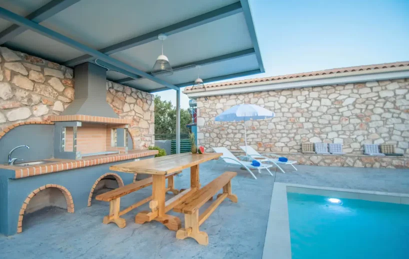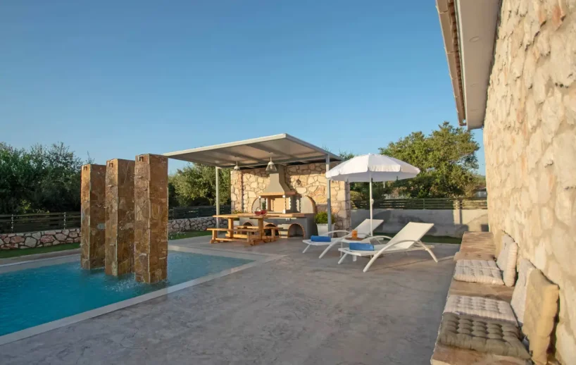 Στην καρδιά του εξωτερικού χώρου δεσπόζει μια ιδιωτική πισίνα, αναδεικνυόμενη από τρεις εντυπωσιακές πέτρινες κρήνες. Ξαπλώστρες, ομπρέλες και αναπαυτικά καθίσματα δημιουργούν το ιδανικό σκηνικό για χαλάρωση στον ήλιο ή για ρομαντικά βράδια κάτω από τα αστέρια. Μια σκιερή πέργκολα με μεγάλο ξύλινο τραπέζι και ενσωματωμένο μπάρμπεκιου σας προσκαλεί να απολαύσετε υπαίθρια γεύματα με την οικογένεια και τους φίλους σας, ενώ ο περιποιημένος κήπος προσθέτει μια δροσερή πράσινη πινελιά και αίσθηση γαλήνης.