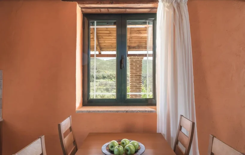 Στο εσωτερικό, η Villa Margarita συνεχίζει την αρμονία παράδοσης και διακριτικής κομψότητας. Το σαλόνι διαθέτει άνετους καναπέδες και κλασικό τζάκι, προσφέροντας έναν ζεστό χώρο για όλες τις εποχές. Η ανοιχτή κουζίνα, πλήρως εξοπλισμένη με σύγχρονες συσκευές, συνδυάζει λευκές επιφάνειες με γήινες αποχρώσεις, ενώ η παρακείμενη τραπεζαρία πλαισιώνει την υπέροχη θέα μέσα από τα μεγάλα παράθυρά της. Παντού, οι πέτρινοι τοίχοι, τα ξύλινα δοκάρια και τα επιλεγμένα υφάσματα δημιουργούν μια ζεστή, ρομαντική ατμόσφαιρα.