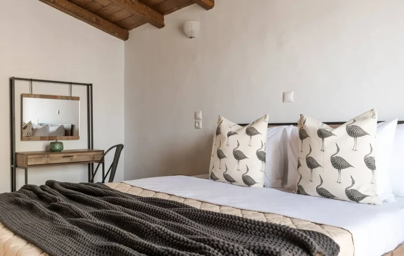 Τα υπνοδωμάτια είναι σχεδιασμένα για ήσυχες νύχτες και γαλήλινα πρωινά. Κάθε χώρος αναδεικνύει τις πέτρινες λεπτομέρειες, τον απαλό φωτισμό και τα προσεγμένα υφάσματα. Τα άνετα κρεβάτια με ποιοτικά λευκά είδη προσφέρουν ξεκούραστο ύπνο, ενώ τα μεγάλα παράθυρα επιτρέπουν στο φυσικό φως να γεμίσει το δωμάτιο και να χαρίσει εικόνες από το ήρεμο τοπίο. Δύο ευρύχωρα μπάνια με σύγχρονες παροχές και walk-in ντους προσθέτουν μια αίσθηση spa, που δένει αρμονικά με την παραδοσιακή αισθητική της βίλας.